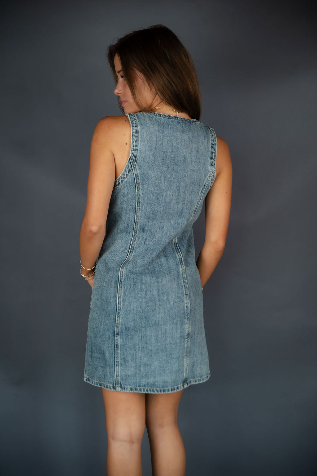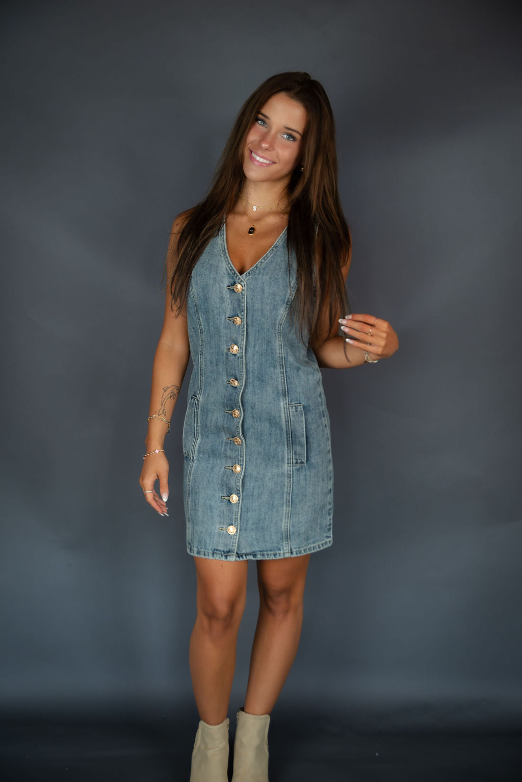 Made from a soft denim, the Tanela Dress is a summer staple. It features a slim fit, novelty button closure and a flattering v-neck.