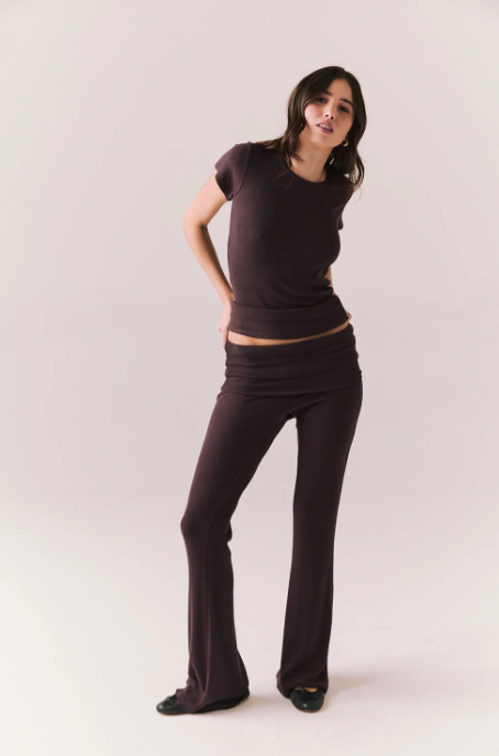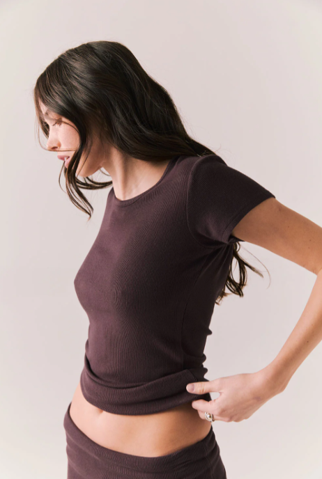 The Honey Espresso Tee features a classic babydoll silhouette with a flirty, sleek fit.