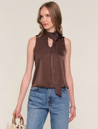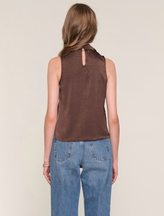 The Joey Top is a sleeveless blouse, made from a lux, hammered satin. It features a tie at front neck and self covered buttons at back neck.