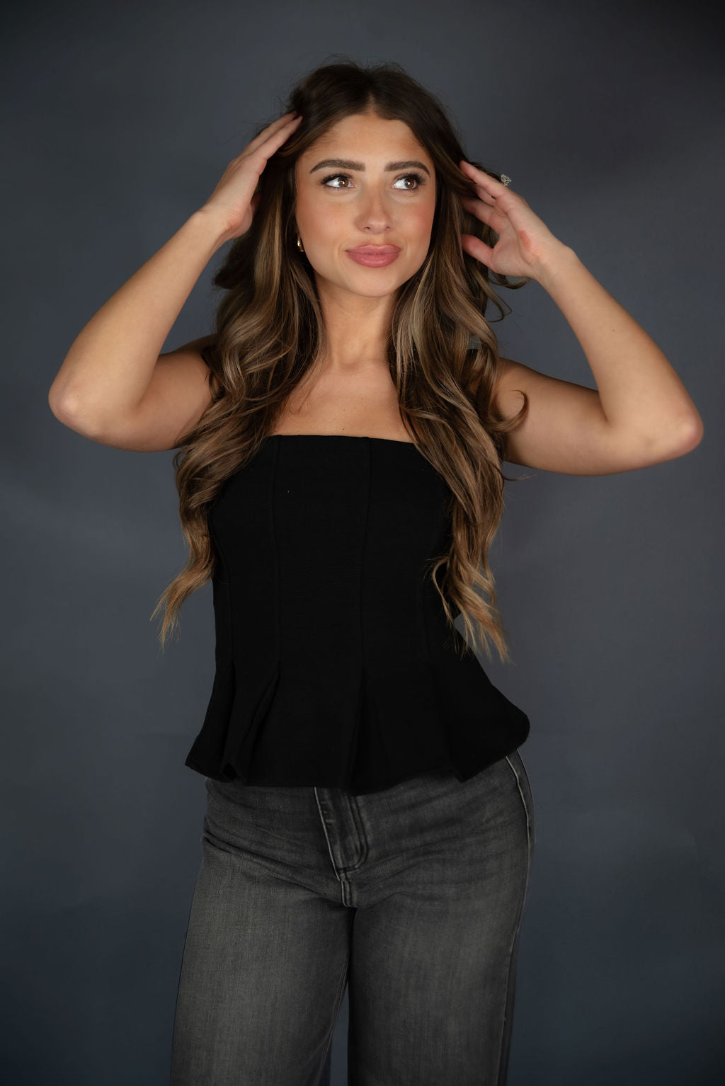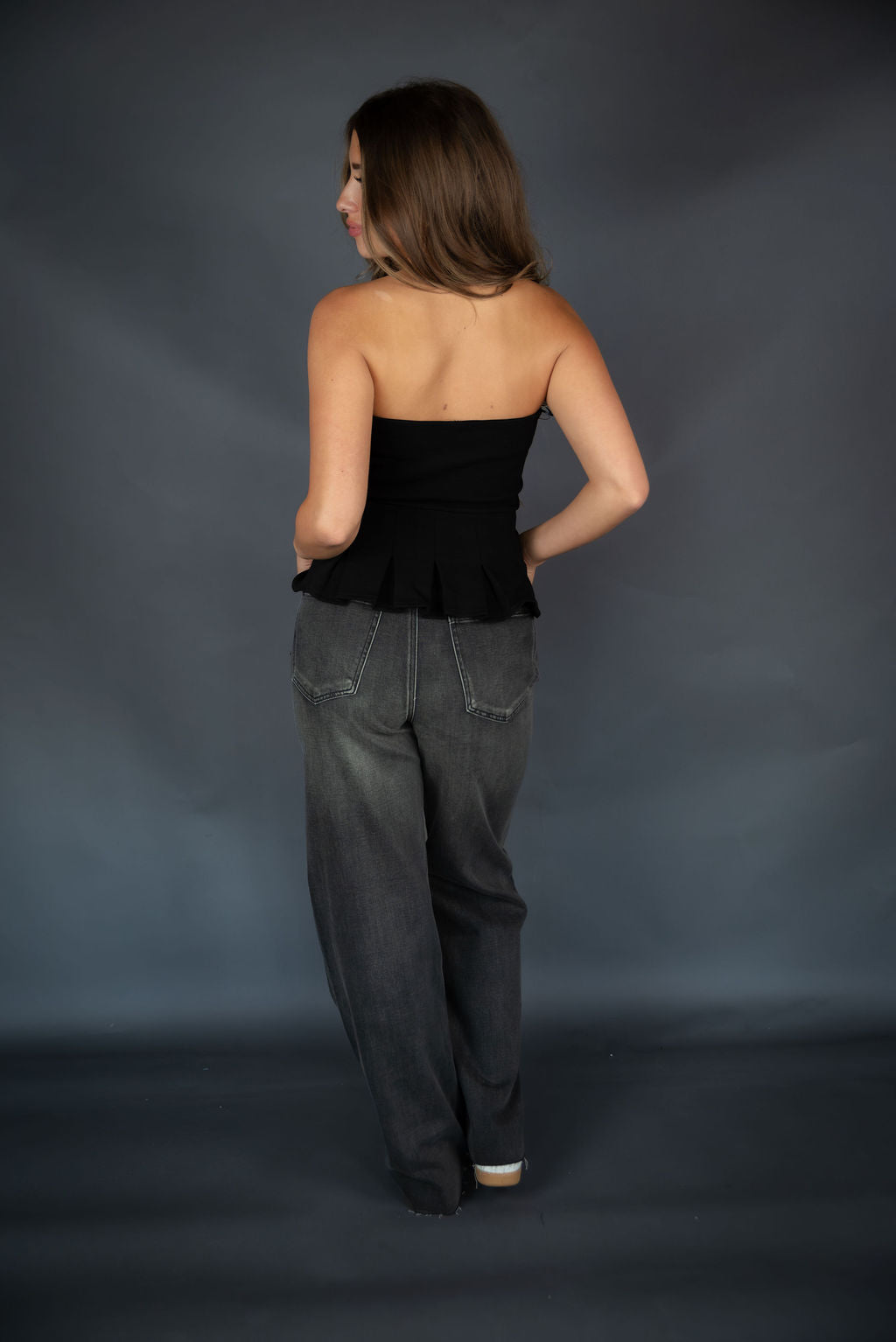 The Jolene Top is a strapless knit made from a stretch waffle. It has a slim fit, zip closure and a flared hem. Pair with jeans to wear from day, to night.