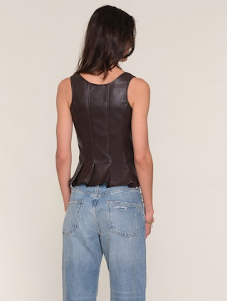 The Larosey Top is made from a faux leather. It features seamed details that release at the waist creating a flared hem.