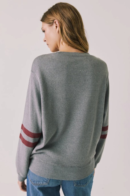 Crafted from soft Streaky Grey fabric, this sophisticated piece features rich maroon stripes along the arms, adding subtle flair.