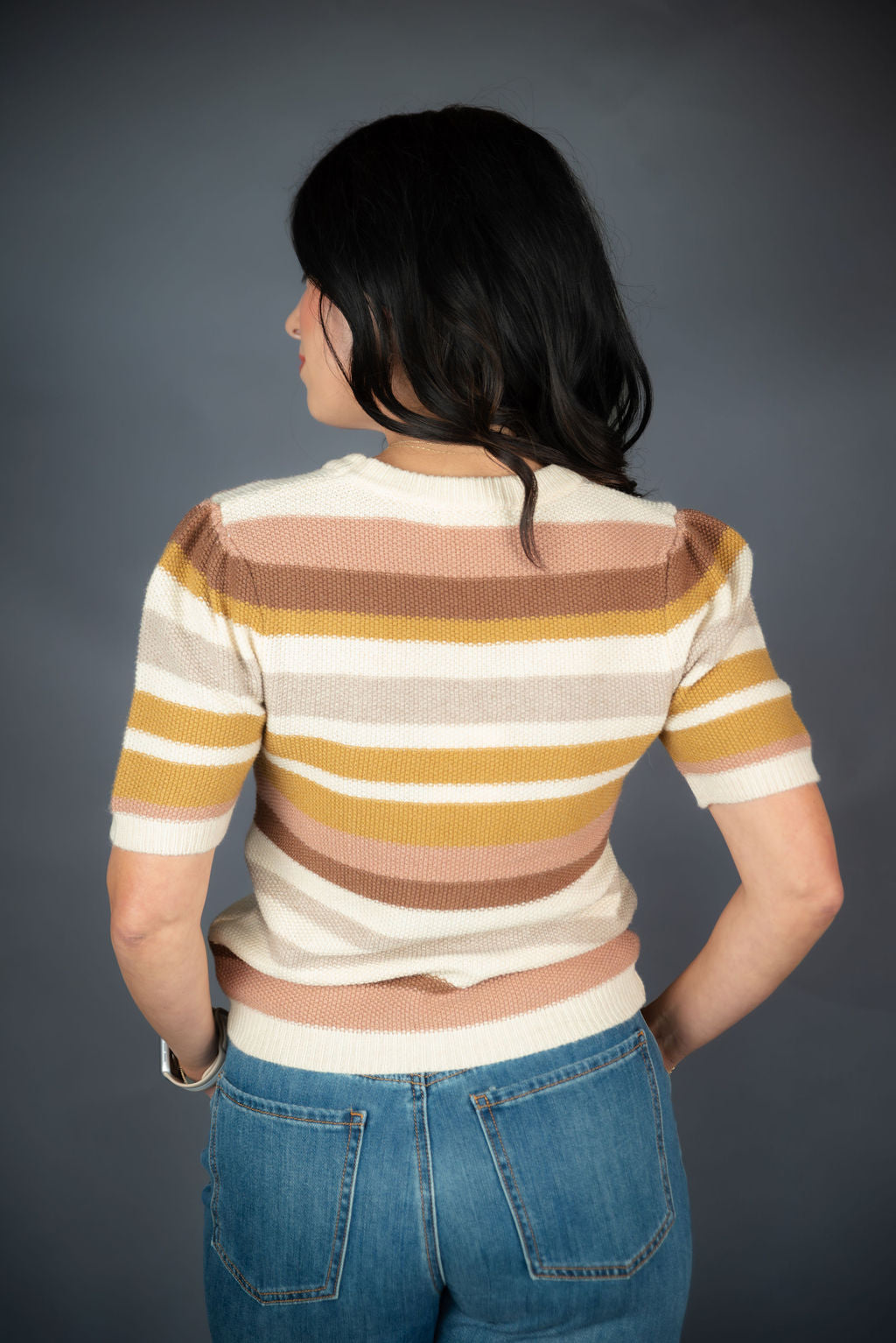 The Shellie Sweater is a simple, crew neck top. It's made from a soft cashmere blend and features an irregular, stripe layout throughout the body.