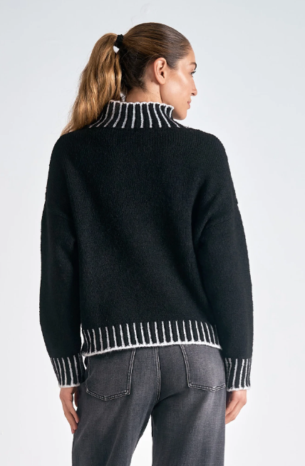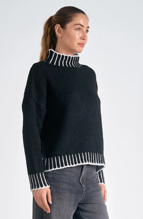 The Valma Sweater wraps you in warmth. Contrast stitching on hems, sleeves, and neck add visual intrigue to this cozy mock turtleneck cold-weather essential.