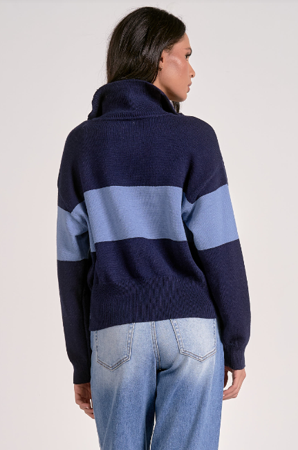 Quarter zip navy sweater, with solid light blue stripe in the center. Pair it with your favorite jeans for a complete look.